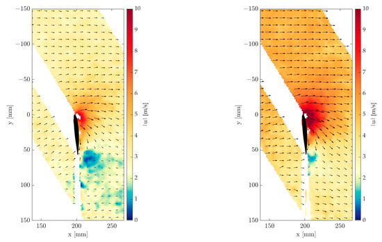 As an example, Figure 9 shows processed flow fields measured during sinusoidal inflow. The velocities are colored, and the flow directions are illustrated with arrows. Since the blade crosses the light sheet, a shadow is cast. These shadowed areas cannot be evaluated and are empty in the figures. The flow fields are acquired at the same blade position but during different states of the sinusoidal inflow. Thus, the left image shows a flow field at the minimum of the flow modulation. Here, two areas are conspicuous in which the wind speed and direction deviate from the inflow. Significantly higher wind speeds of up to 8 m/s can be detected on the rotor blade, some of which extend over the entire blade surface. In contrast, in the bottom right area of the image, areas can be observed where very low wind speeds and no dominant wind direction exist.