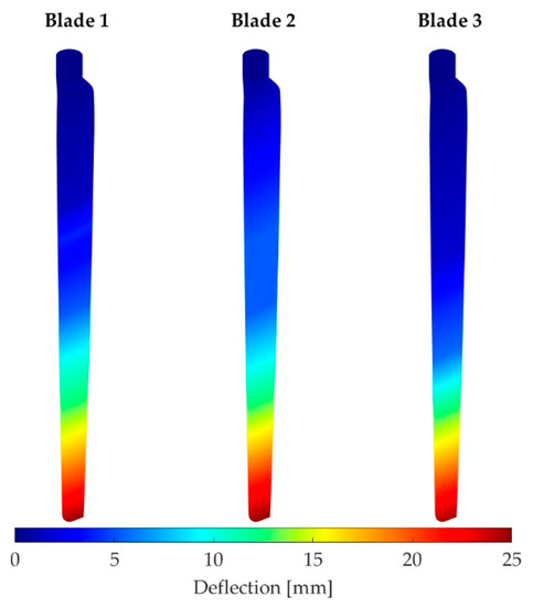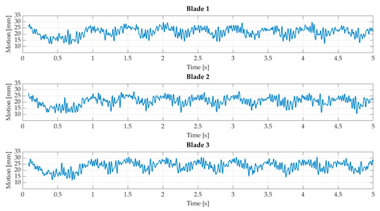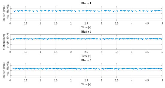 Figure 13 shows the deformation profile with sinusoidal inflow. The expected characteristic deformation behavior can be seen for all three blades. The maximum deflection is 31 mm, and the constant deflection is approximately 20 mm. In comparison to the steady flow, the constant deflection is smaller. However, the tower effect can also be seen in this setup. In addition, the constant deflection of the three blades varies. This effect can probably be explained by different target positions on the respective blades and a minor misalignment of the turbine.
