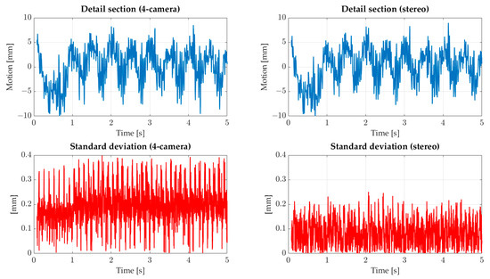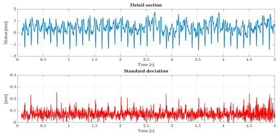 In Figure 14, a detailed section and the standard deviation profile can be seen. The detail section is balanced with the mean value without the constant offset. The motions lie in an interval from −10 mm to 5 mm, where the minimum is reached within the first second. After the first second, the profile shows a sinusoidal profile and a minimum of −5 mm.