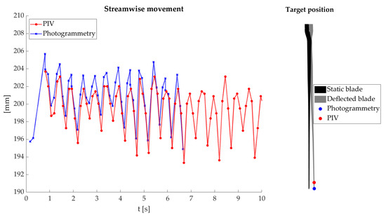 The deformation is determined by image correlation using PIV for a data set with sinusoidal inflow for further comparison. The blade deformation can only be determined at the 12 o’clock position for the PIV system. Although the deformations are determined for 10 s with the PIV system, the photogrammetry system could only acquire data for 5 s.