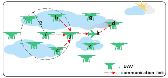 In order to clarify the problem, we use Figure 1 as an example, which shows UAV nodes and communication links in UANETs. Source nodes want to send packets to the destination node d at different time slots. Then, packets will be forwarded through nodes j and k successively and finally reach the destination node d. Hence, relay nodes j and k will take on more communication tasks, leading to the nodes becoming congested and more likely to run out of energy. Assuming node j is on the verge of death, but node i does not receive the latest hello packet from the node, if the node still sends packets to node j, it will cause packet loss.
