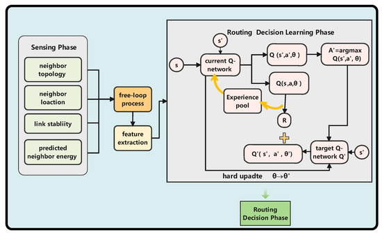 - A double deep Q network with prioritized experience replay is used to assist in making routing decisions efficiently. We take geographical location, residual energy, and link stability into account when selecting the next hop. According to the above-considered factors, a more appropriate reward function is designed to make the algorithm converge more quickly.