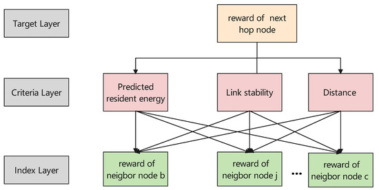 In order to acquire appropriate weights and , The analytic hierarchy process (AHP) method is used. The AHP structure of the reward function is shown in Figure 3. In our scenario, the target layer of the AHP model is the reward of a selected next hop node. The criteria layer is our above-considered factors. The index layer is the reward of different neighbor nodes.