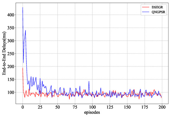 Convergence performance comparison of average E2E delay between QNGPSR and DSEGR in the training phase.