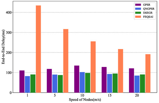 Performance comparison of the end-to-end delay among GPSR, QNGPSR, DSEGR, and FEQSAI with different node movement speeds.