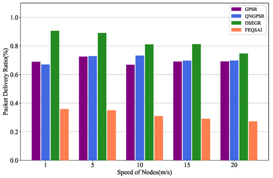 Performance comparison of the PDR among GPSR, QNGPSR, DSEGR, and FEQSAI with different nodes’ movement speeds.