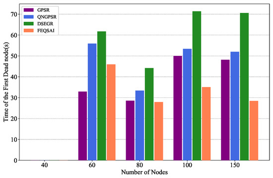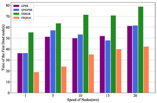 Performance comparison of the time of the first dead node among GPSR, QNGPSR, DSEGR, and FEQSAI with different numbers of nodes’ movement speeds.