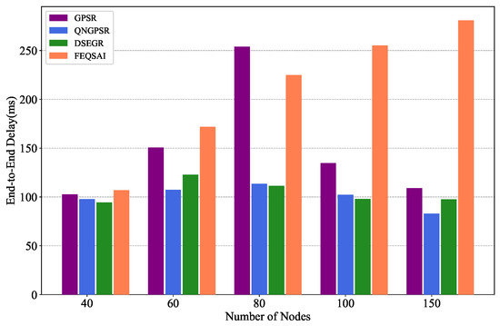 Figure 8 shows the effects of the different network densities on the average E2E delay. As can be seen, with the increase in node density, the average E2E delays of DSEGR, QNGPSR, and GPSR increase firstly and then decline. That is because the nodes can achieve more long paths which lead to an initial increase in delays, but the routing void area decreases as the node density increases, which causes an increase in delay. However, FEQSAI needs to relearn online when the number of nodes increases. the average E2E delay of DSEGR increases since Q-Tbale learning complexity increases. So the FEQSAI has the worst delay performance. The average E2E delay of DSEGR is similar to QNGPSR at the same node density. However, GPSR chooses the perimeter forward when it encounters a void area, which causes its average E2E delay to be larger than DSEGR and QNGPSR.