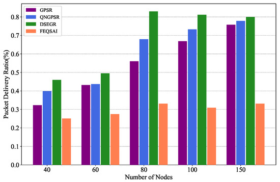 Figure 9 depicts the relationship between PDR and different node densities. It can be seen that, with the total number of nodes increasing in the UANET, each node has more neighbor nodes. Even if some neighbor nodes’ energy is exhausted, there are other neighbor nodes providing assistance to forward packets. Thus, there is an increasing trend in the packet delivery ratio of each protocol. DSEGR significantly outperforms QNGPSR, GPSR, and FEQSAI since DSEGR considers link stability and residual energy prediction. Although FEQSAI considers E2E transmission energy, it is an online learning algorithm and cannot converge in our scenario, so the PDR is the worst.