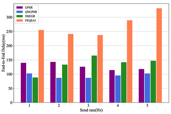 Performance comparison of average E2E delay among GPSR, QNGPSR, DSEGR, and FEQSAI with different packet send rates.