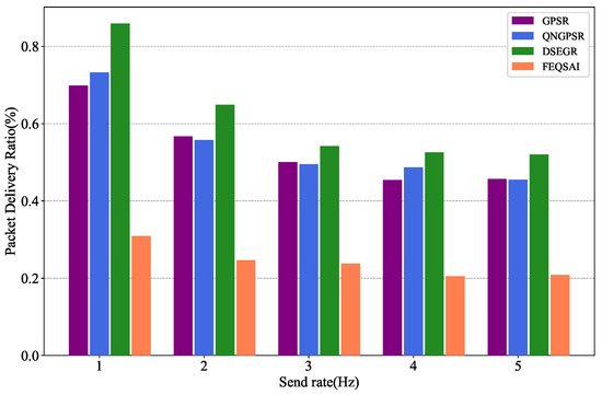 Performance comparison of PDR among GPSR, QNGPSR, DSEGR, and FEQSAI with different packet send rates.