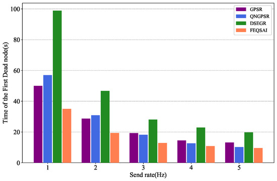 Performance comparison of the time of the first dead node among GPSR, QNGPSR, DSEGR, and FEQSAI with different packet send rates.