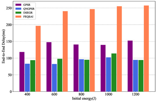 Figure 14 depicts the relationship between the average E2E delay and different initial energy. As we can see from the figure, as the initial energy increases, the average E2E delay of DSEGR is similar to QNGPSR. The delay of DSEGR and QNGPSR is better than the others since they reduce the routing void area.