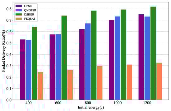 Performance comparison of PDR among GPSR, QNGPSR, DSEGR, and FEQSAI with different initial packet energy.