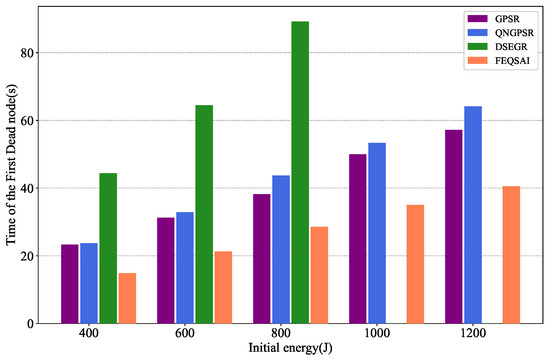 Performance comparison of the time of the first dead node among GPSR, QNGPSR, DSEGR, and FEQSAI with different initial energy.