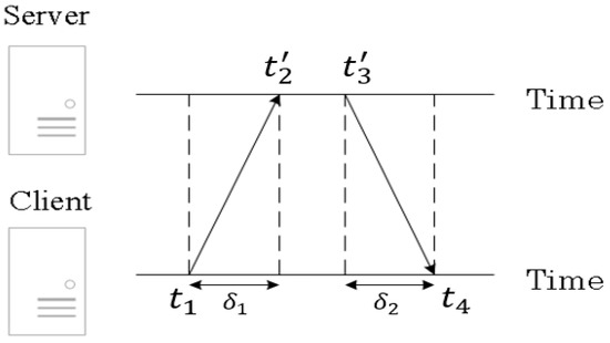 The basic synchronization principle of NTP [4] is as follows. As shown in Figure 1, an NTP client sends a request packet to the NTP server and the server replies with a response packet that contains two timestamps: one is the time it receives the request packet () and the other is the time it sends out the response packet (). For the client, it knows the time that the request packet is sent () and the time that the response packet is received (). After the client receives the response packet, it has all four timestamps and can then calculate its clock difference from the server. Time stamps and are expressed with a prime because they are based on the server clock, while and are based on the client clock. The difference between the server clock and the client clock is called the clock offset (or offset, in short), θ. This is what the NTP intends to find [5,6]. Let be the one-way delay (including packet transmission time and propagation delay) from the client to the server, and be the one-way delay from the server to the client. Then, we have
