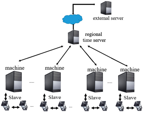 In networking, a server is a machine that provides services. A client is the machine that seeks services from the server. An NTP server is therefore a server that runs the NTP code to provide time synchronization services. In a large-scale network, the NTP server architecture is hierarchical, with the root NTP server at the top and clients at the bottom. In between the root NTP server and client are multiple levels of intermediate NTP servers. We considered a reference architecture in our NTP study, as shown in Figure 3. A regional time server was set up in the local factory network. There were multiple machine tools in the factory. These machine tools needed to be synchronized within the 1 ms requirement and hence served the role of NTP clients. The regional time server was the one just above the client machine tools, and the external server was one level above the regional time server.