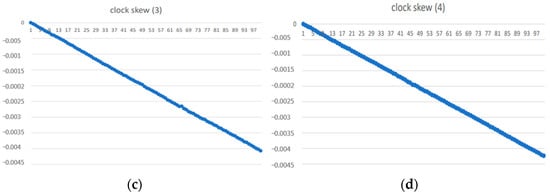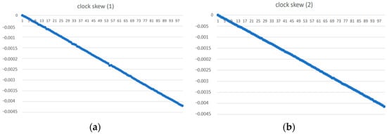 The slopes of the four measurement results are −2.65 μs/s, −2.62 μs/s, and −2.57 μs/s, −2.68 μs/s, and the average of the four measurements is −2.63 μs/s [10]. If the client sets NTP to synchronize every 16 s, −2.63 μs/s multiplied by 16, is approximately equal to −42 μs, and this −42 μs is the clock_drift in Equation (7).