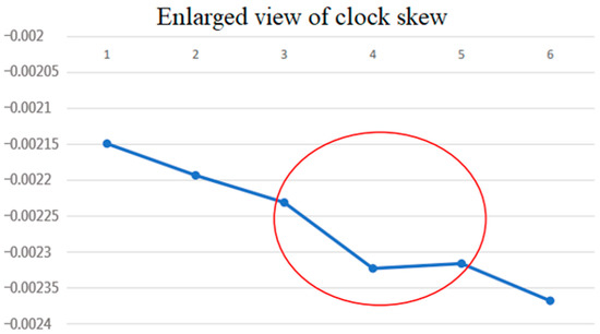 However, from Figure 5, it can be seen that at the fourth clock skew measurement, the packet encounters a small network delay. The slope from point x = 3 to point x = 4 in the figure becomes steeper to −5.75 μs/s, while the slope from point x = 4 to point x = 5 becomes smoother and positive at 0.44 μs/s. It can be seen from this that when there is a bigger network delay jitter, the synchronization result will be affected. This motivated us to propose a mechanism that nullifies certain NTP offset derivations and clock synchronization when the corresponding run trip delay times are higher than normal, in order to achieve more accurate synchronization.