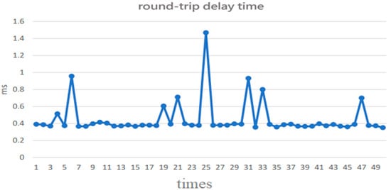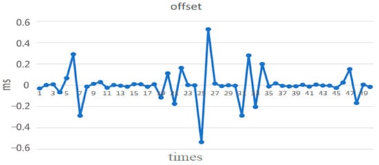 Typically, an NTP client sends a synchronization packet to the local time server every 16 (or 32 or 64) s. Figure 6 and Figure 7 show the offset and round-trip delay time (or round-trip time; RTT) measurement results, respectively, from the first 50 synchronization packet exchanges at the 16 s interval in this paper [11]. It can be observed that the offset varies with the network round-trip time [12,13].