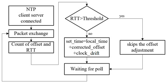 We conducted two NTP experiments (A and B), both of which always adjusted the local clock based on the derived offset from the NTP timing packet exchange in each 16 s interval, and compared them with the third experiment (C), which skipped the clock adjustment if the RTT (round-trip time) of the NTP timing packet exchange was above a certain threshold. The threshold was set at 1.5 ms tentatively. Experiment A was carried out from 12 noon to 1 p.m., while experiment B was carried from 1 p.m. to 2 p.m. Experiment C was carried out from 2 p.m. to 3 p.m. Figure 8 [14] is the flow chart of adaptive clock adjustment. It can be seen from Table 1 that the average offset in experiment C was reduced to within 0.1 ms from above 0.2 ms in A and B, and the maximum offset was also reduced to within 1 ms from above 3 ms in A and B, reaching the goal of clock accuracy for IIoT. Therefore, the mechanism of adaptive clock adjustment can effectively improve the synchronization accuracy.