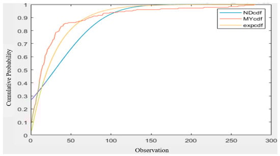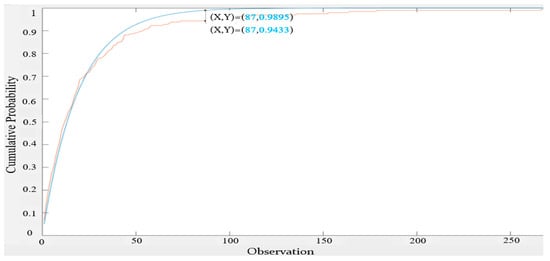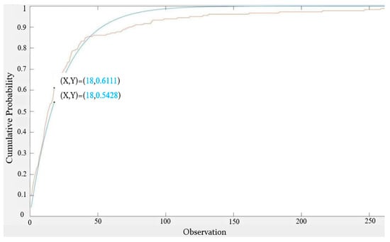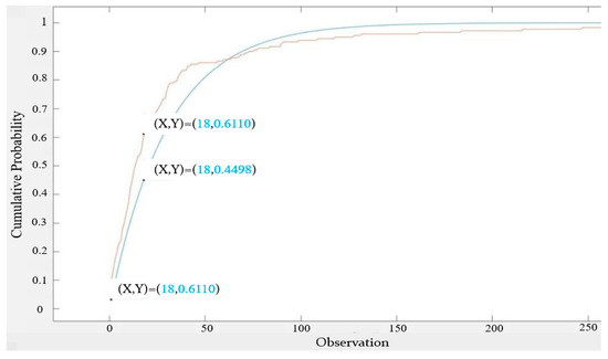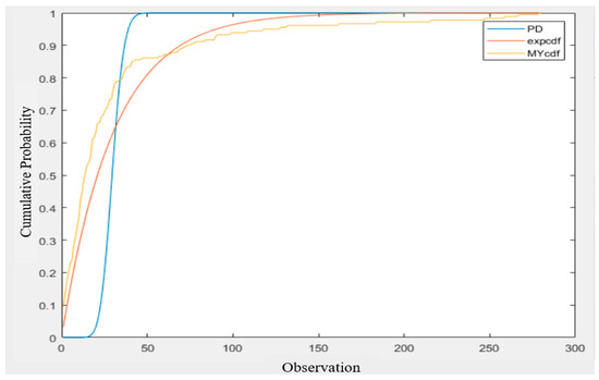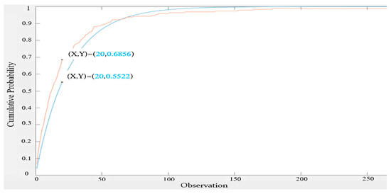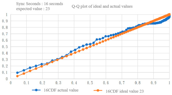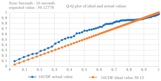 We also used the Q–Q plot to observe the fitting with the two exponential distributions. By comparing Figure 11 and Figure 12 [17], it can be clearly seen that the exponential distribution with an expected value of 23 was a better fit.