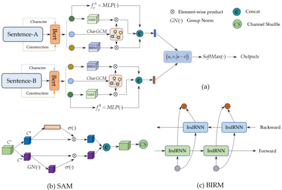 (a) The overall network structure of CharAs-CBert; (b) The slice attention module (SAM); (c) The bidirectional independent recurrent neural network module (BIRM). Where “” indicates character graph convolution module; indicates independent recurrent neural network; indicates classifier with softmax; indicates the activation function of ; indicates the operation of multilayer perceptron; and indicate the channels of input features and satisfies . indicates the operation of GroupNorm; ⊕ indicates element-wise product operation. indicates language model of pre-training; indicates channel shuffle operation; indicates backward layers of ; indicates forward layers of . and represent the a priori word vector feature obtained by the multi-layer perceptron () of sentence A and sentence B, respectively.
