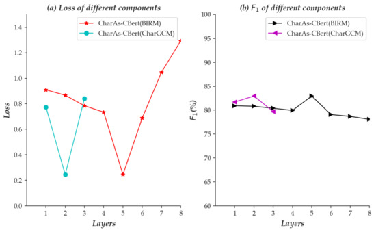 From Figure 4, we can see that with the increase in the number of layers in the BIRM and CharGCM components, the sentence representation effects () and show a trend of increasing first and then decreasing. When the number of layers of BIRM is five and the number of layers of CharGCM is two, the sentence representation effect is optimal. For example, when the number of layers of CharGCM is two, the accuracy is higher than that of three layers. The possible reason for this is that a small number of layers cannot fully capture the contextual global semantics of a sentence, and when the number of layers is large, it is easy to reuse redundant information, resulting in a decrease in the accuracy of sentence representation.
