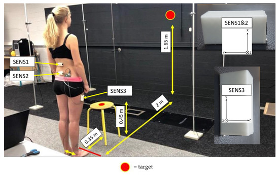 NLBP subject in starting position for the b&r test. The targets on the stool and on the wall in front of the subject are shown (red points). A zoom on the sensors is shown in the inset of the figure (on the right). The respective coordinate system (X, Y, Z) used is shown for SENS1&2 and for SENS3.