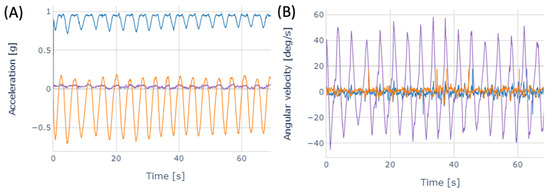Typical traces of (A) Acc X (blue), Acc Y (purple), and Acc Z (orange) and (B) Gyr X (blue), Gyr Y (purple), and Gyr Z (orange) time series recorded with SENS1 during a b&r test in a healthy NLBP subject.