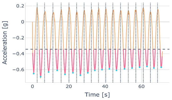 Principle of cycle segmentation based on minima of Acc Z. The dashed horizontal line represents the global threshold (40% above the global minima). The dotted vertical lines represent the cycle limits that lie in the middle of two consecutive local minima. The pink lines show the part of the time series that is below the threshold, the orange lines show the time series that is above the threshold, and the blue dots show the minima of the pink lines.