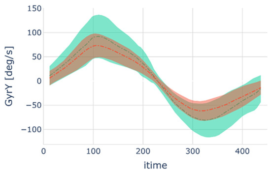 The result of the segmentation process was a data set of 1678 cycles labeled with their respective index (CLBP patient or healthy NLBP subject). Figure 3 show the principle of segmentation. Figure 4 shows all the computed cycles for Gyr Y of SENS2 as a function of time in the form of a mean cycle and a shaded area indicating the cycle’s SD.