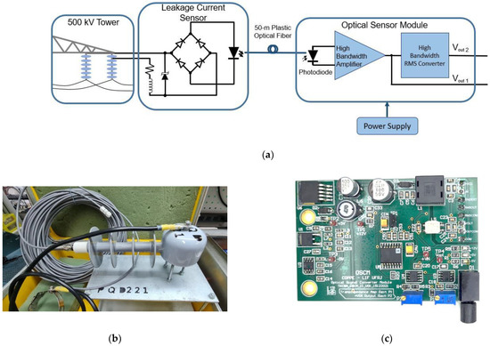(a) Block diagram of the leakage current sensor and optical sensor module; (b) a sensor inside an IP66-rated enclosure, with the POF (plastic optical fiber) cable and the electric electrode; (c) PCB of the optical receiver.
