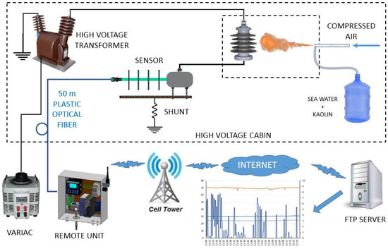 Figure 3 shows the block diagram of the test. The variac transformer, together with the high-voltage transformer, generates a voltage of up to 35 kV that is applied to the insulator under test. At this point, the voltage and current can be monitored by the oscilloscope through a high-frequency current transformer (HFCT) and a high-voltage probe. The LC and PD flowing on the insulator are directed to the sensor and then to the ground potential through a 10-Ω shunt resistor. The voltage over the shunt resistor, divided by 100, is the total LC that can be seen on the oscilloscope. Finally, the output of the OSM is monitored by the oscilloscope, where the real and measured currents can be compared.