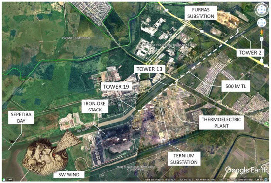With all laboratory tests performed, three units were taken to the field for installation on three 500-kV transmission line towers. This TL transports the energy generated by the Ternium Steel Co. thermoelectric plant to the Furnas National Grid Substation, both located in Santa Cruz, Rio de Janeiro, Brazil. Figure 5 shows a satellite picture of the area, indicating the three towers where the sensors were installed and the steel company area, as well as the location of the iron ore storage stack and the southwest wind direction. This wind direction prevails during part of the year and blows salty sea fog from Sepetiba Bay, along with iron oxide dust from the company’s stack toward the TL, to accumulate on the surface of the insulator.