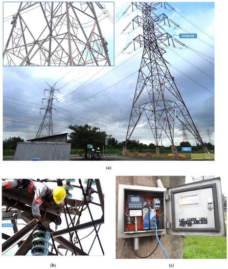 (a) Live-line personnel climbing Tower 19 for the installation of the sensor; (b) The technician is connecting the sensor between the two last sheds of a 25-unit insulator string; (c) The remote unit (RU), fixed at the foot of the tower.