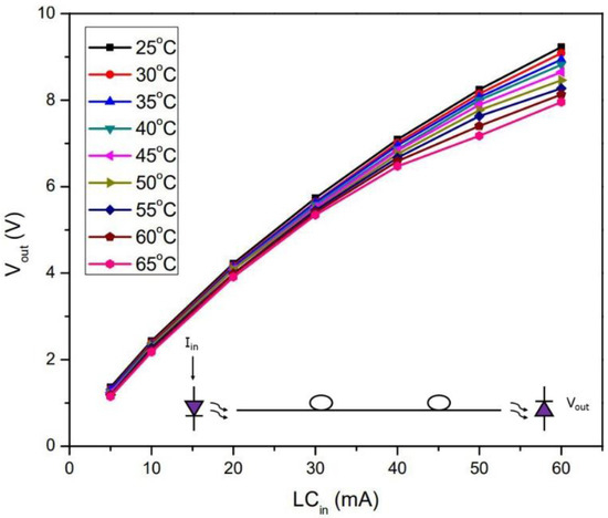 Temperature does not cause fiber losses; however, it does change the LED performance as well as the photodiode sensitivity. For checking these effects on the sensor system, the optical transmitter, a 50-m length of fiber optic cable, and the receptor were placed in an oven and the system performance was measured at temperatures from 25 °C to 65 °C. Figure 7 shows the result of such a test for the different leakage currents. It is possible to deduce that as the temperature increases, the LED output power decreases and the photodetector response decreases for any current. Bearing in mind that the average leakage current is around 20 mA, the uncertainty at this temperature range is about 3.8%, which is perfectly acceptable for the type of information that we require.