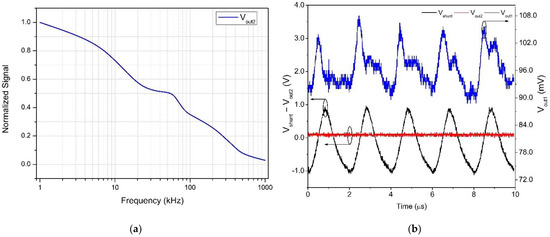 System response of the sensor for an input sinusoidal waveform at different frequencies. (a) Frequency response curve, demonstrating the circuit’s capability of responding to frequencies close to 1 MHz. (b) Black trace: a 500 kHz sinusoidal input current, measured on a 10 Ω shunt resistor. Blue trace: response of the system to a 500 kHz input (Vout1, Figure 1a). Red trace: RMS equivalent of the input current (Vout2) (Black circles around curves indicate the applicable vertical axis).