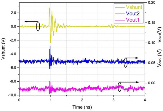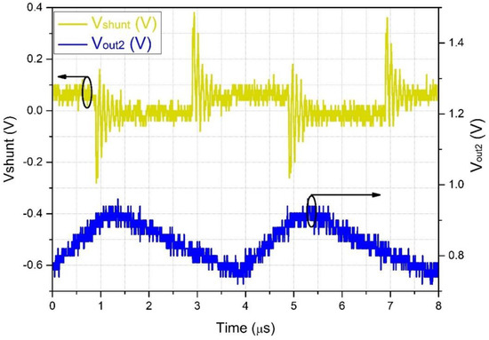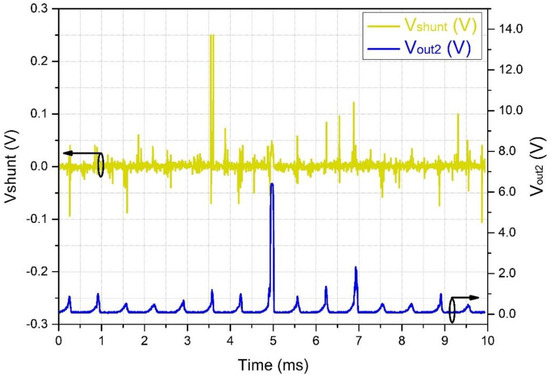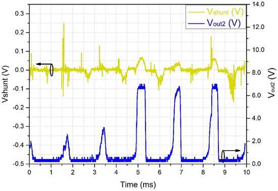 According to Chen et al. [5], leakage currents are composed of several high-frequency discharges, known as partial discharges. In their work with artificially polluted insulators in a climate chamber with a series configuration of a current transducer, Chen et al. recorded pulses of up to 12 kHz, superimposed on a 60-Hz sinusoidal signal. In the present work, we applied high bandwidth devices in the whole measuring chain that were capable of detecting high-frequency PD pulses. For testing the frequency response of the current sensor, a variable-frequency sinusoidal current provided input to the sensor and its outputs Vout1 and Vout2 were monitored. Figure 9 shows the result of such tests. The input current was measured on a 10 Ω shunt resistor, connected in series with the sensor.
