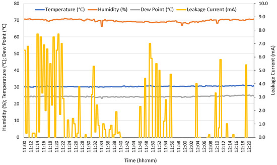 Figure 15 shows favorable weather conditions in which the insulator remains at an average leakage current below 15 mA. Although the humidity rises to almost 90%, no increase in leakage current was observed, confirming that in dry conditions, no LC occurs. Roman et al. [14] concluded in their work that the LC increases from 0.01 mA to 0.08 mA when the humidity rises to up to 90% and the temperature drops to about 5 °C. By inputting these weather conditions in Equation (1), we find a dew point of 3 °C, which is below the local temperature; therefore, no humidity would accumulate on the insulator surface. This explains the low LC. In the present work, the humidity also increased but the local temperature remained above the dew point, which guaranteed a constant LC.