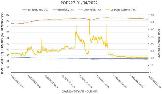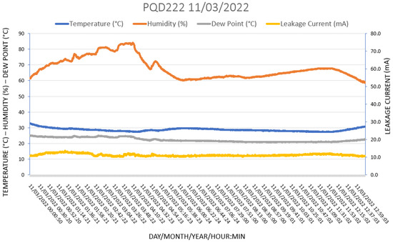 Figure 16 shows a sudden increase in humidity above 90% at midnight, together with a temperature drop that is close to reaching the dew point. The consequent increase in the insulator surface humidity has made the LC rise to 15 mA. However, just after dawn at 8 a.m., the temperature rose to 38 °C and the humidity dropped to 50%, with the consequent dropping of the LC to 10 mA.