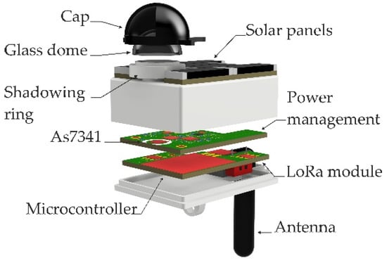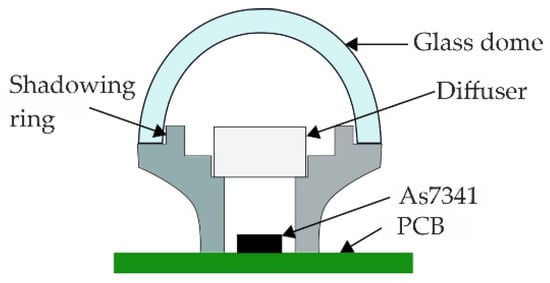 The sensor chip AS7341 is mounted on a PCB as shown in Figure 2. A hole in the housing lid permits light to reach the sensor. This hole is covered by a diffuser disk of polymethyl methacrylate (PMMA), which ensures a homogenous illumination on the sensor. The housing of the node acts as a shadowing ring, blocking incoming radiation from an angle bigger than 180 degrees to prevent the sensing of radiation reflected by the ground. The glass dome protects the sensor and the circuitry from dirt or water. Figure 1 [] shows a schematic of the cross-section of the sensing part of the sensor node.