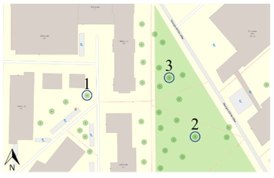 Marked position of the trees that were considered for the experiment, numbered from 1 to 3 (modified map from openstreetmap.org accessed on 10 January 2022).