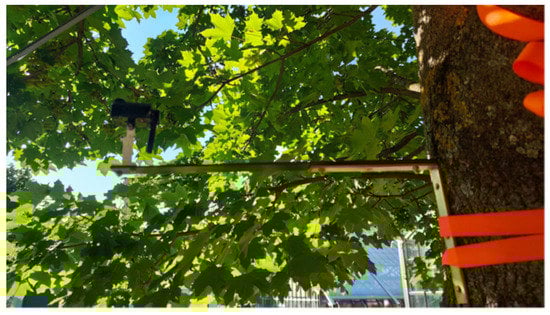 For the field experiment with deployment, the sensor node B was installed on Tree 1 of Table 1, by fixing it to a bar (see Figure 4). The reference node A was placed on a glass roof at the position 48.01353° N, 7.83358° E.