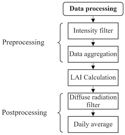 The gathered light intensities of the two sensor nodes have to be first filtered and processed to obtain a valid LAI reading. Data which do not fulfill the requirements of the Monsi-Saeki model must be excluded. Moreover, data preprocessing and filtering is necessary to remove noise that is generated from (1) unstable weather not guaranteeing diffuse radiation conditions, (2) measurement inaccuracies below the canopy due to sudden movement of the leaves that is caused by the wind, and (3) technical issues such as missing data. In this section the filters, the preprocessing, and postprocessing methods, shown in Figure 5, will be presented.