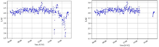 The measured LAI with respect to the daytime during doy 259 before (left) and after (right) applying the diffuse radiation filter.