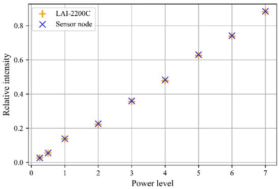 Measurements with the sensor node and the LAI-2200C were triggered within a time difference of maximum 1 s. The measurements were executed at different power levels of the light source: between power level , which corresponds to the maximal power, and power level when the light is switched off. Figure 8 shows the relative intensity that was measured with the sensor node and the LAI-2200C for the different power levels of the light source. It must be pointed out that for the sensor node, the average value over the number of sensor channels is plotted.
