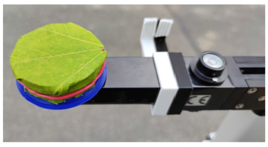 The sensitivity range of the LAI-2200C is between 320 nm and 490 nm [], whereas for the spectral sensor that is used in the presented sensor node, it lies between 415 nm and 680 nm in the visible range []. Since the transmittance and the reflectance of the leaves depend on the wavelength, differences between the transmission that is measured with the LAI-2200C and with the different channels of the newly-developed sensor are expected. To estimate the range of the measurement differences, the transmission of the sensor node and of the LAI-2200C was measured when the sensors are completely covered with a leaf of Norway maple tree. For this purpose, both instruments were equipped with a ring that allows their complete coverture as shown in Figure 9.