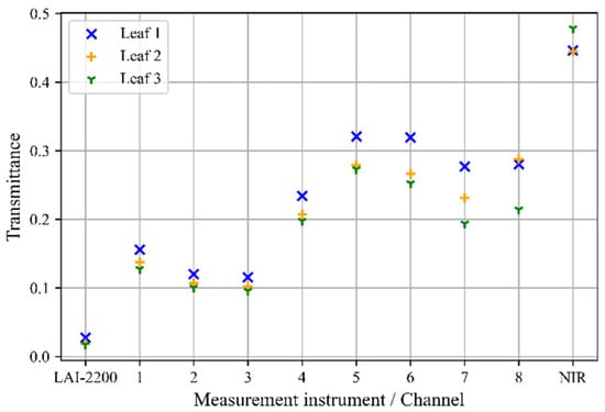 In Figure 10, the relative transmittance that was measured by different channels of the spectral sensor and the LAI-2200C for the three leaves are displayed. It can be observed that the LAI-2200C measures a transmittance of 0.021, which is within the range of the transmittance that is documented in the literature for this type of a tree []. The transmittance that was measured with our sensor node is in general higher for all integrated channels. The sensor node’s channel 3, with a peak sensitivity at 480 nm, shows the smallest transmittance of 0.105. The unexpected high transmission level of the sensor node can be explained with the fact that the filters of the spectral sensor are not filtering the NIR (near infrared) light completely. To minimize the difference between the LAI that is measured with the newly-developed sensor node and the LAI 2200C, we have chosen channel 3 for the subsequent experiments.