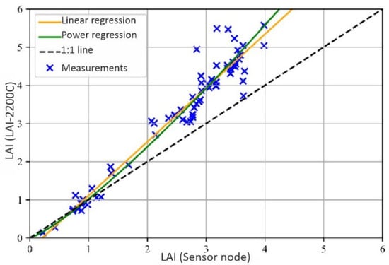 Relationship between the LAI that was measured with the LAI-2200C and with our sensor node in the field experiments. The plot also contains two optimized regression functions to fit the data: a linear and a power regression function.